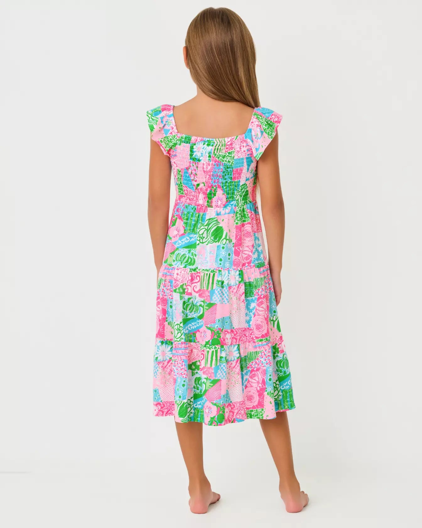 This playful girls’ midi dress features a colorful patchwork print in pink, blue, and green with a smocked bodice for a comfy, flexible fit. Ruffled straps and a tiered skirt add twirl-worthy charm, making it perfect for sunny days, parties, and vacations.