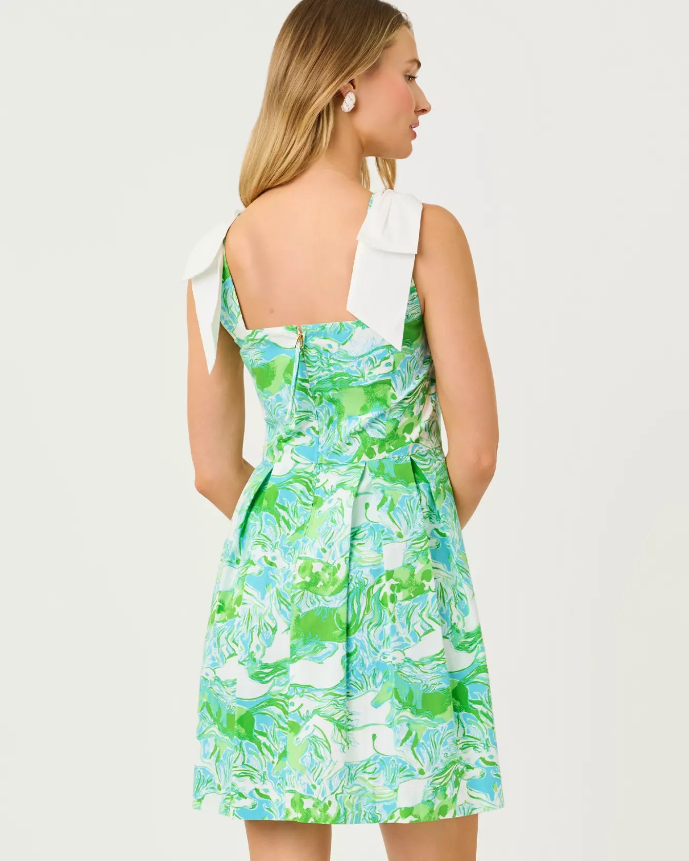 Make every RSVP feel special in this fit-and-flare mini, featuring a vibrant green-and-blue print that feels made for sunny days. Sweet shoulder ties, a square neckline, and a softly pleated skirt create a flattering, feminine silhouette that’s perfect for showers, graduations, and garden parties.