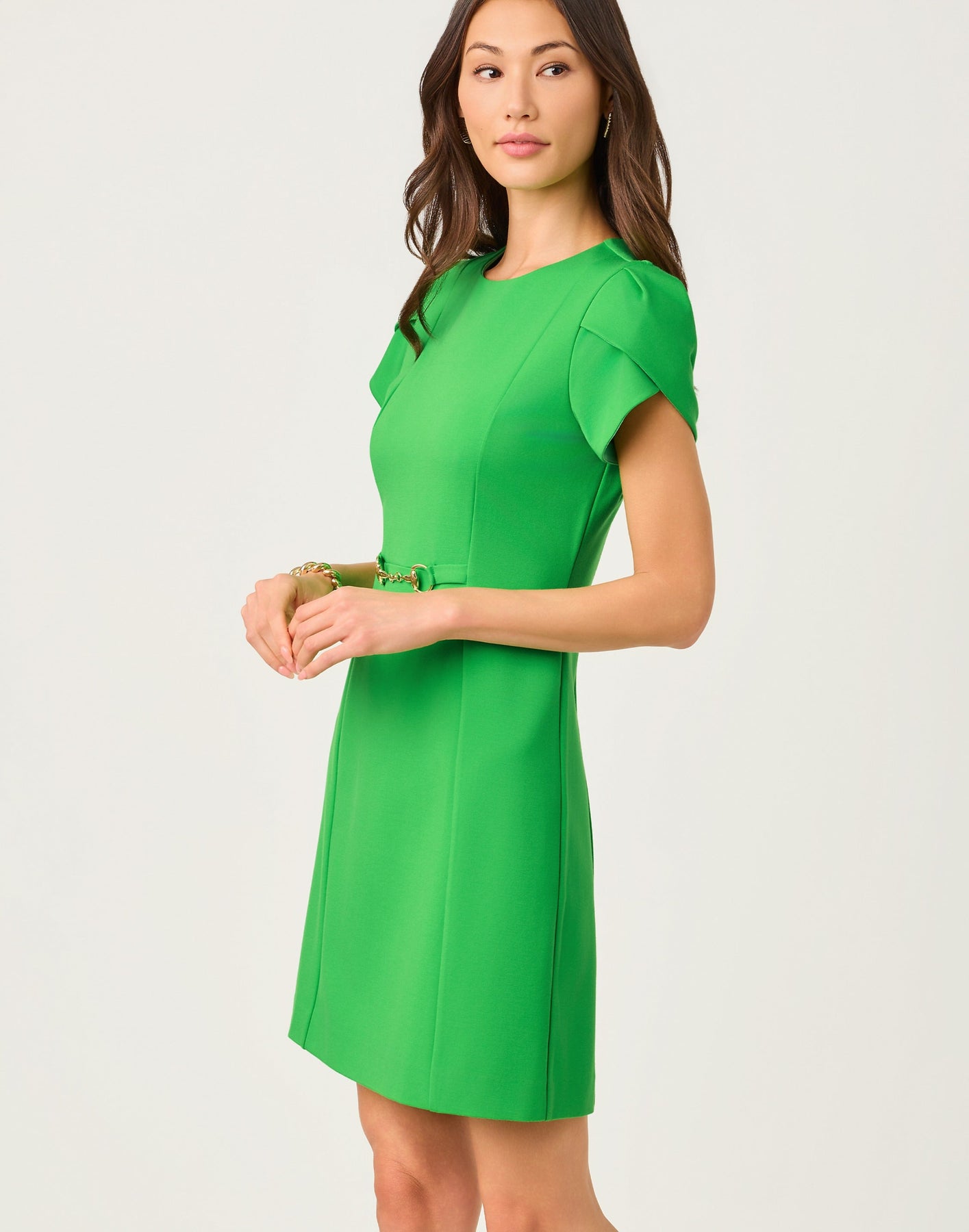 Command the room in this tailored green sheath, finished with sculpted sleeves and an equestrian-inspired gold bit detail at the waist. Clean lines and a flattering, just-above-the-knee length make it a polished go-to for desk-to-dinner days, luncheons, and special events.