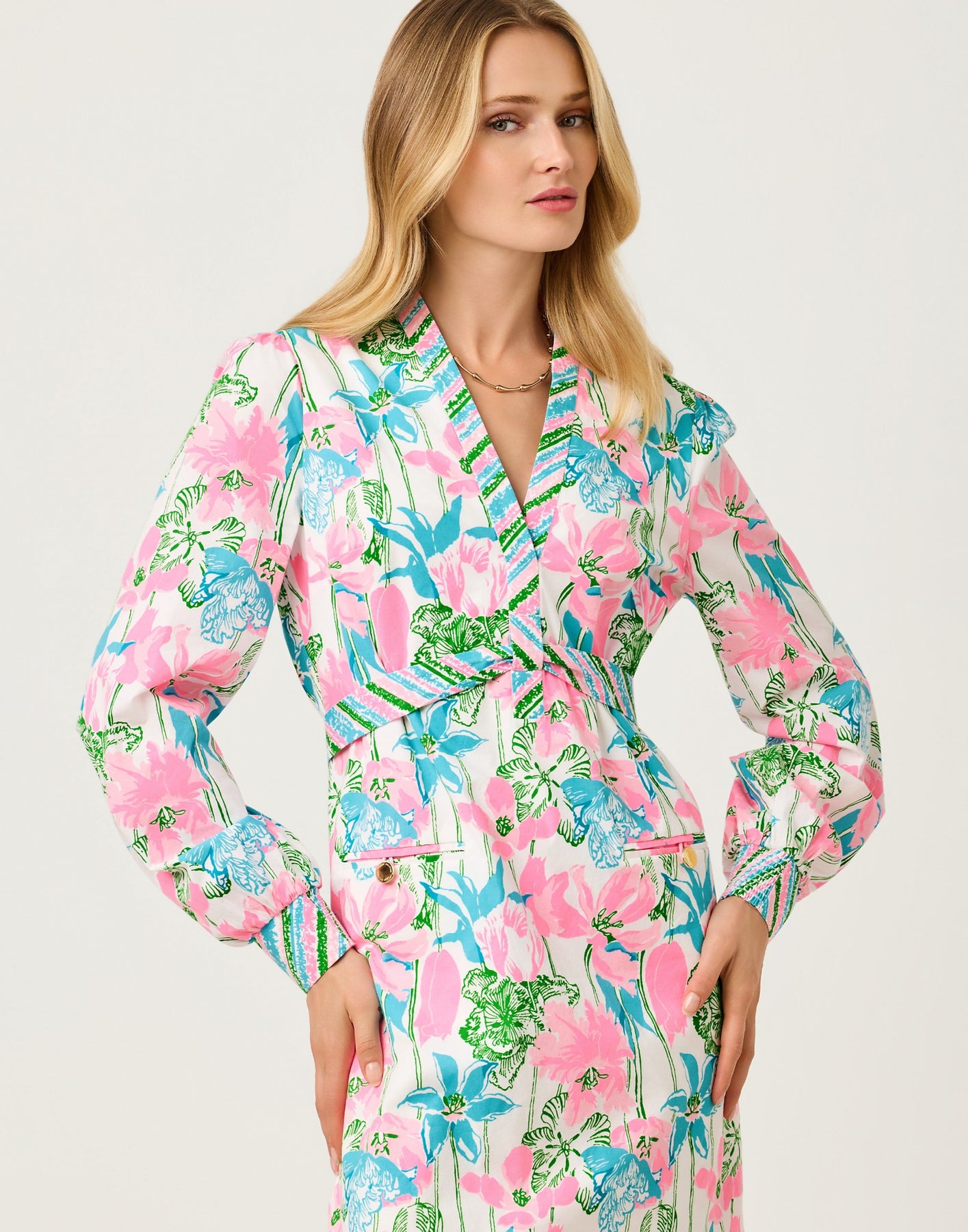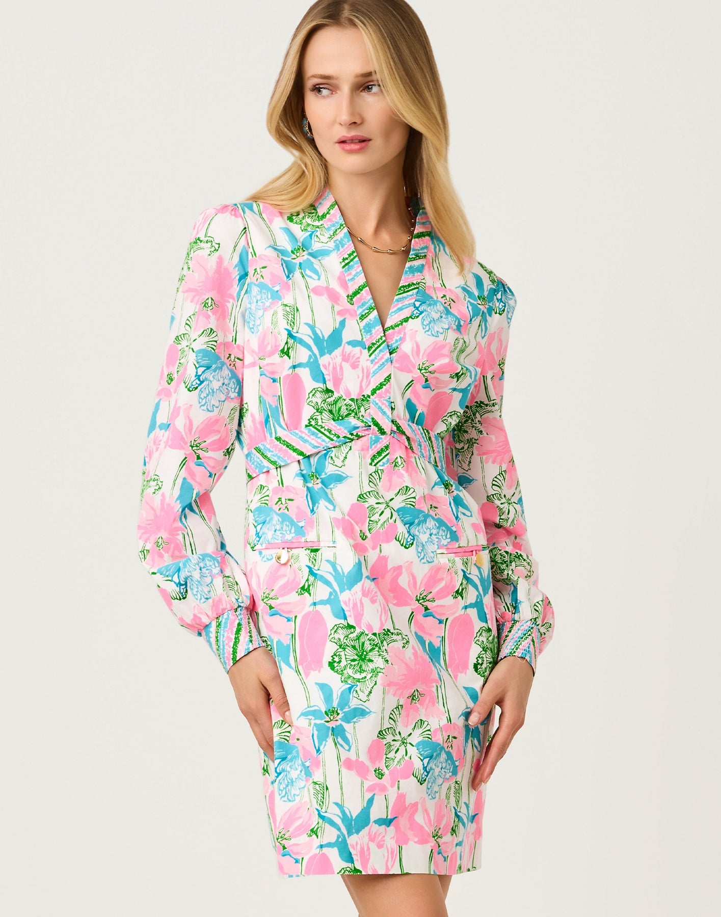 Step into full-bloom style with this long-sleeve woven dress, patterned in a vibrant mix of pink, aqua, and green florals. A flattering surplice neckline, waist-defining striped band, and easy A-line skirt make it an effortless choice for luncheons, showers, and every colorful spring occasion.