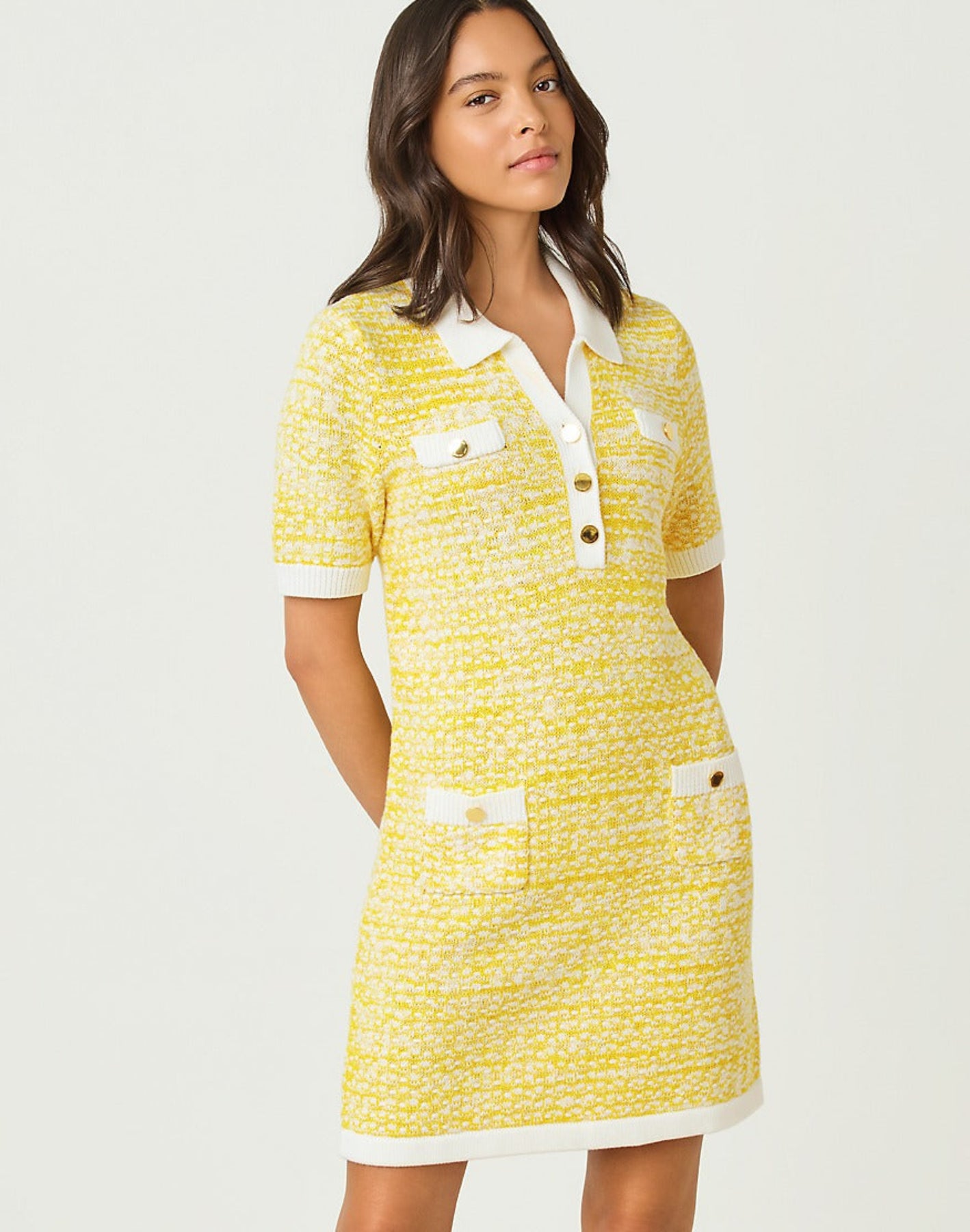 The Theodorah Polo Sweater Dress in Estelle Yellow Metallic brings refined sophistication to your wardrobe. Crafted with a timeless polo collar and sweater dress construction, this piece delivers both comfort and elegance. The striking yellow metallic finish catches the light beautifully, adding dimension and visual interest to any outfit. Perfect for layering or wearing solo, it transitions effortlessly from casual weekends to professional settings. A modern essential that combines classic design with contemporary flair.