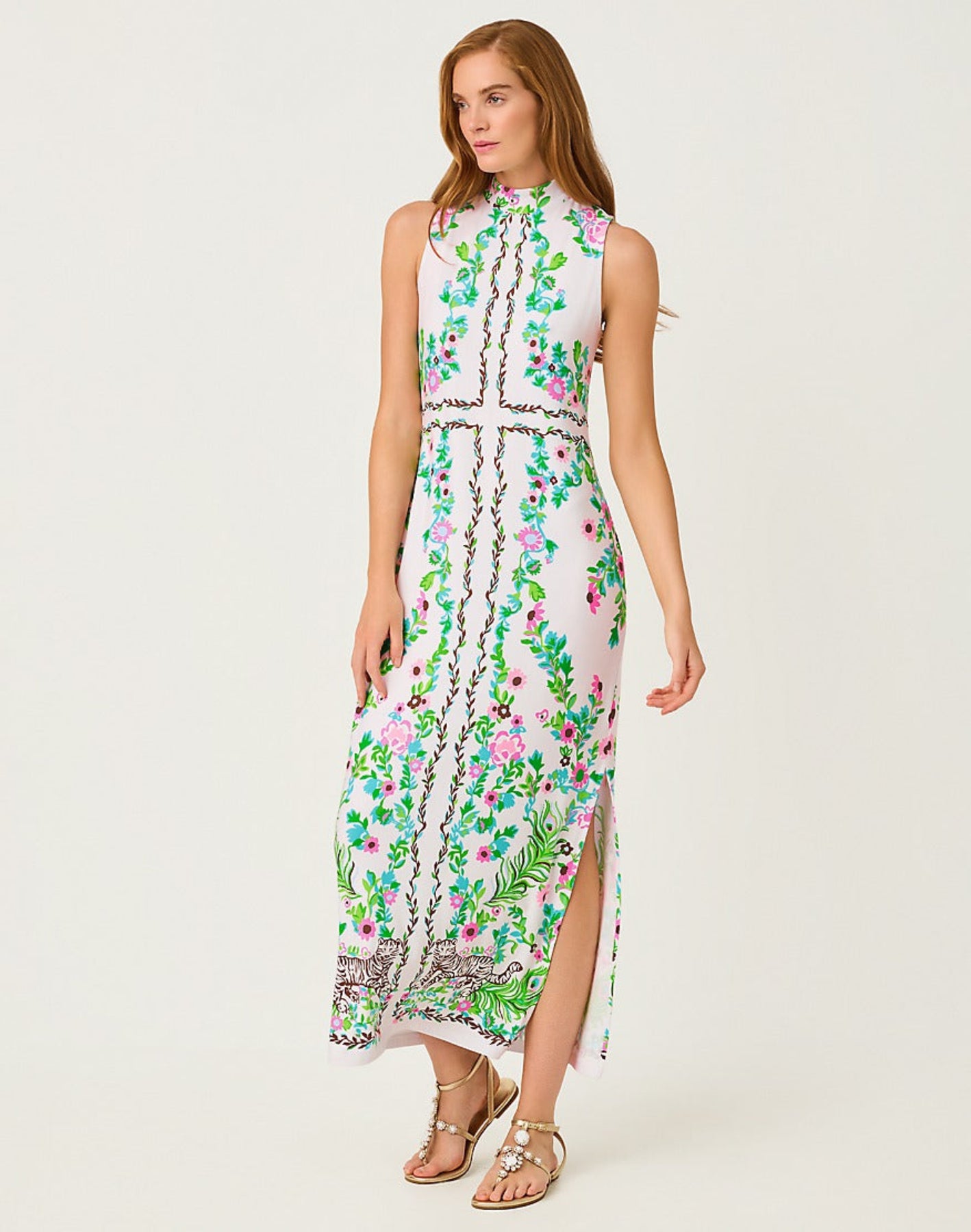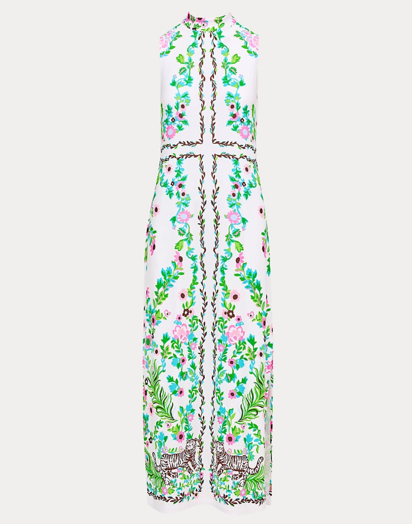 The Wellington Maxi Dress in Resort White Royal Zoo is a sophisticated choice for warm-weather elegance. This flowing maxi silhouette features a striking animal-print design that brings playful energy to any occasion. The lightweight fabric drapes beautifully, making it ideal for resort getaways, garden parties, or casual summer outings. The Resort White base keeps the bold Royal Zoo print fresh and wearable, while the maxi length offers timeless appeal and versatility. Perfect for layering with sandals or statement jewelry to elevate your seasonal wardrobe.