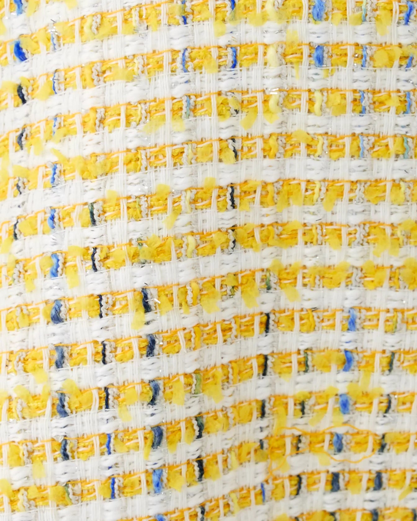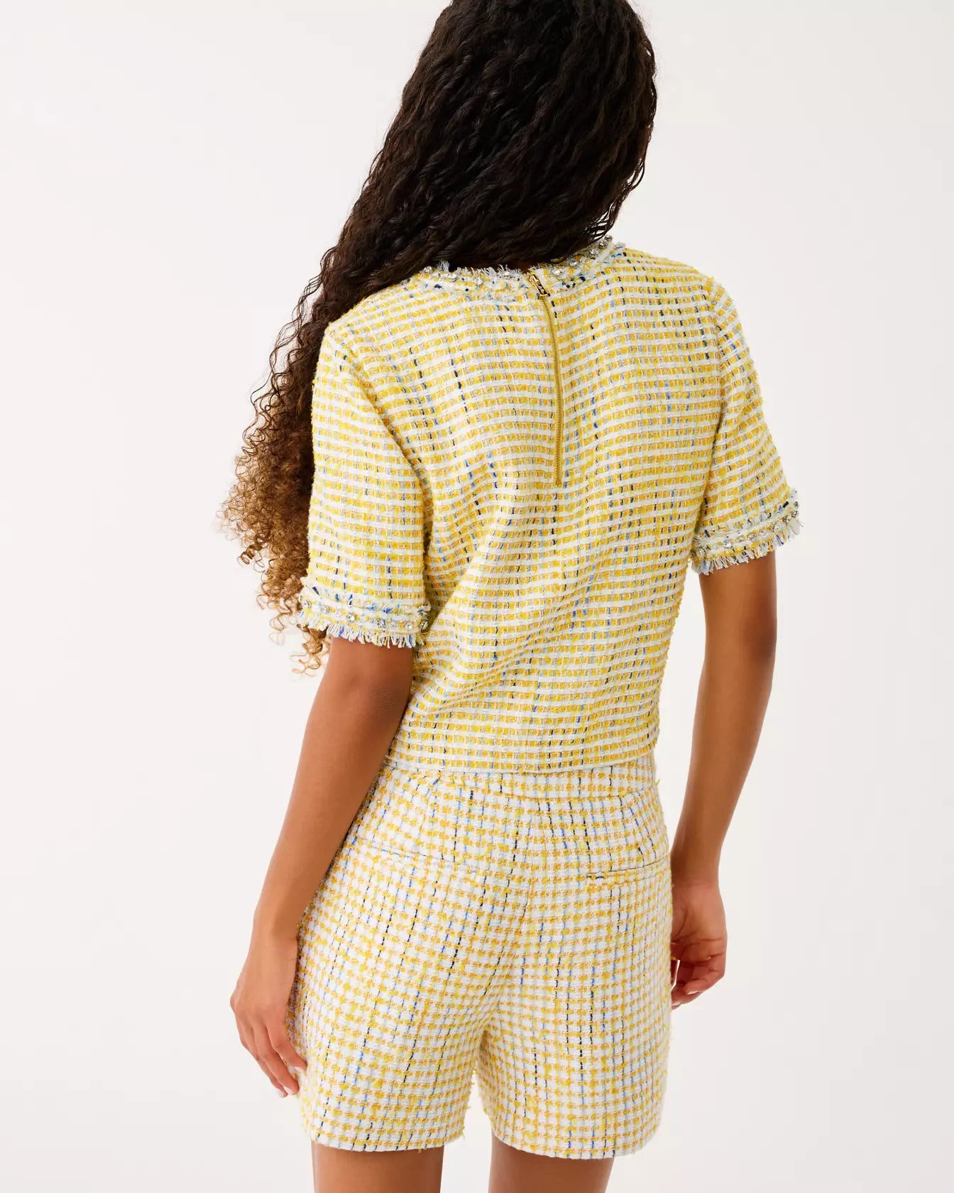 Playful and polished, this yellow tweed short-sleeve top features a boxy silhouette with fringed trim at the neckline and sleeves for a chic, textural finish.
